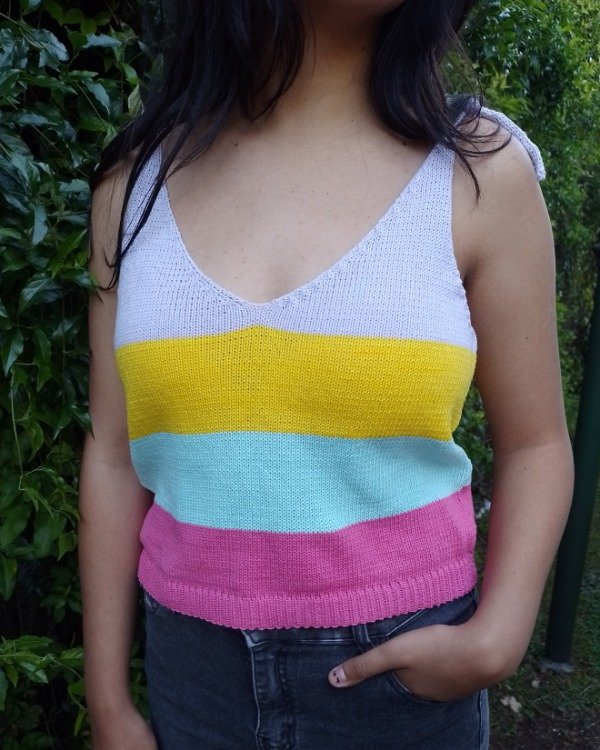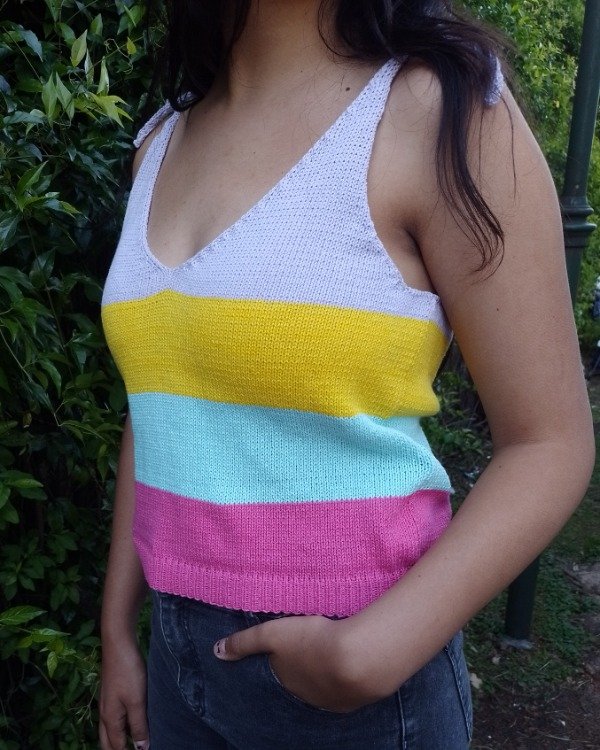 Combinación única en tonos rosa chicle, celeste, amarillo y lila. (Mismo diseño en la espalda)
