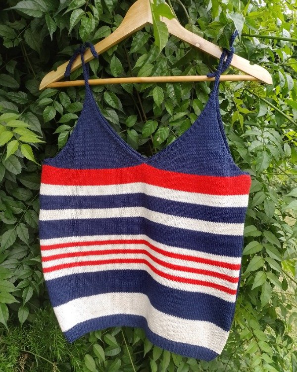 tejida en tonos azul marino, rojo y crudo, con estilo náutico